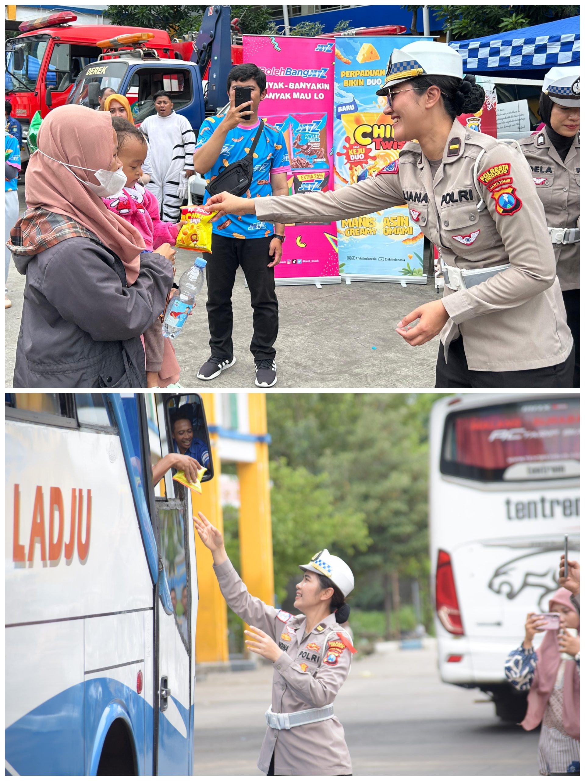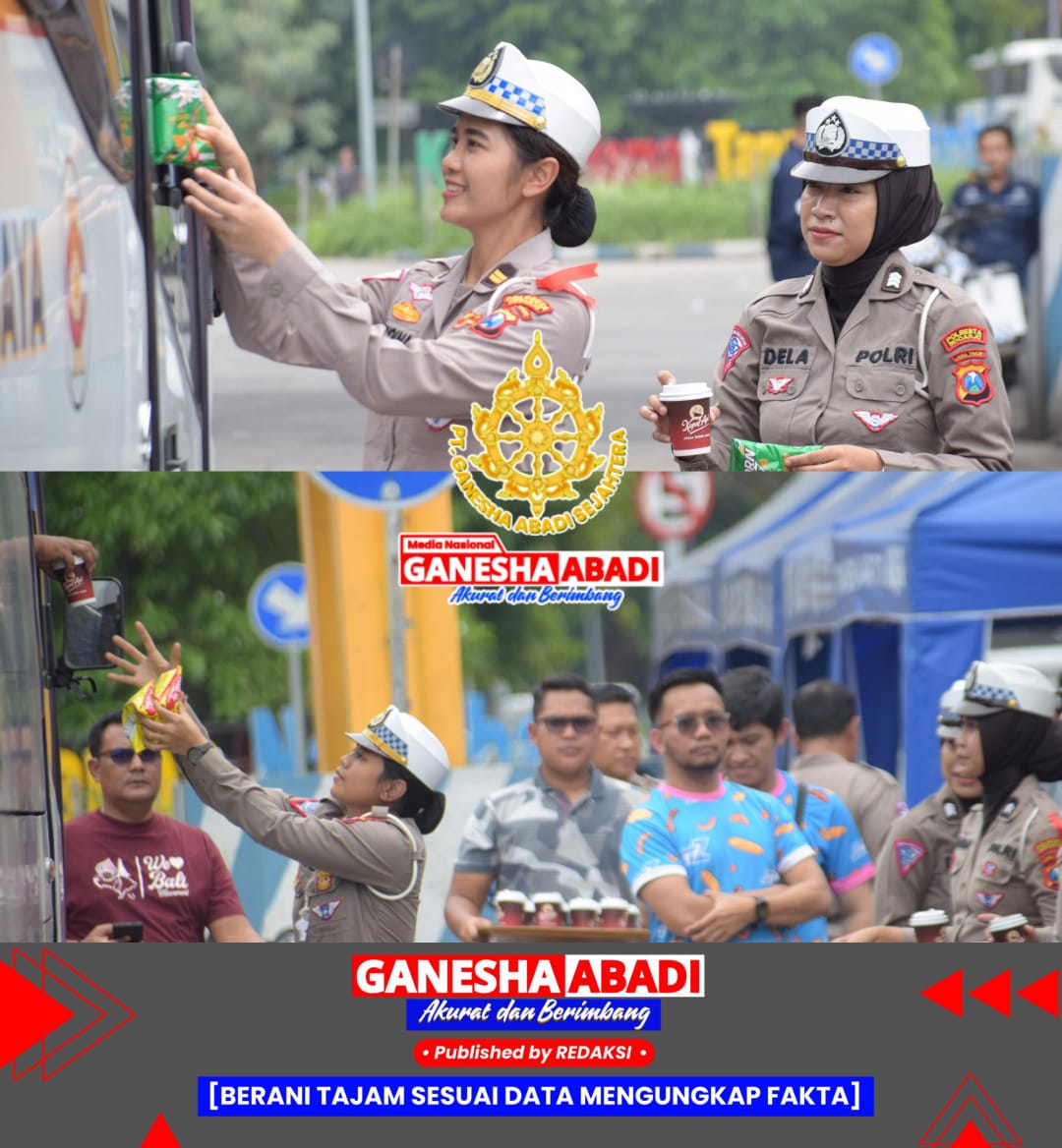 Sidoarjo – Polisi wanita (Polwan) dari Polresta Sidoarjo menunjukkan aksi simpatiknya dalam Operasi Lilin Semeru 2024 di Terminal Purabaya, Bungurasih, Waru, Minggu (29/12/2024). Dipimpin oleh Iptu Ayudina Prakasa dan Ipda Liana, mereka menyapa para penumpang bus dengan senyum ramah sambil membagikan kopi dan snack gratis.