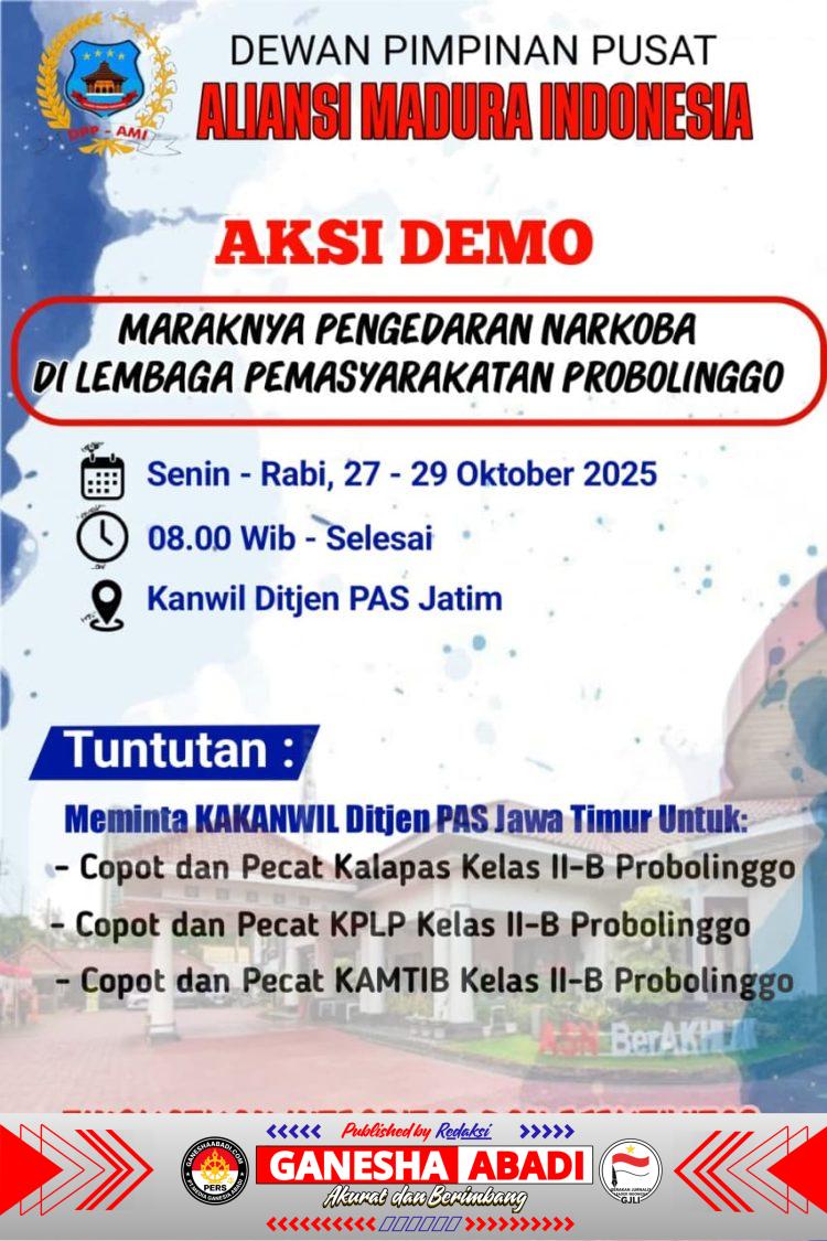 Surabaya – Dewan Pimpinan Pusat (DPP) Aliansi Madura Indonesia (AMI) akan menggelar aksi besar-besaran di Kantor Wilayah Direktorat Jenderal Pemasyarakatan (Ditjen PAS) Jawa Timur, Senin hingga Rabu (27–29 Oktober 2025), mulai pukul 08.00 WIB. Aksi ini merupakan bentuk keprihatinan dan desakan tegas terhadap dugaan maraknya peredaran narkoba di Lapas Kelas II-B Probolinggo.