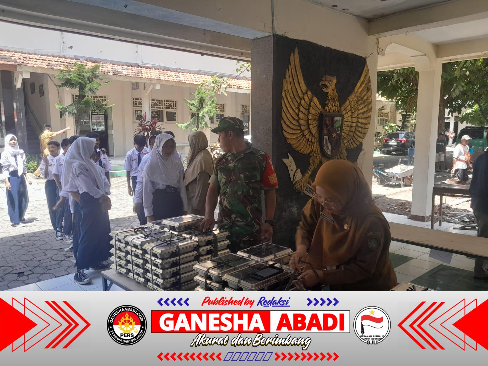 Surakarta, Babinsa Joyotakan Koramil 03/Serengan Kodim 0735/Surakarta Serka Sudiyono melaksanakan Pendampingan pendistribusian Makan Bergizi Gratis (MBG) di SMP Islam Bakti Jl. Wahid Hasim Rt 03 Rw 01 Joyotakan Serengan Kota Surakarta, Kamis Pukul 10.00 Wib (27/11/2025)