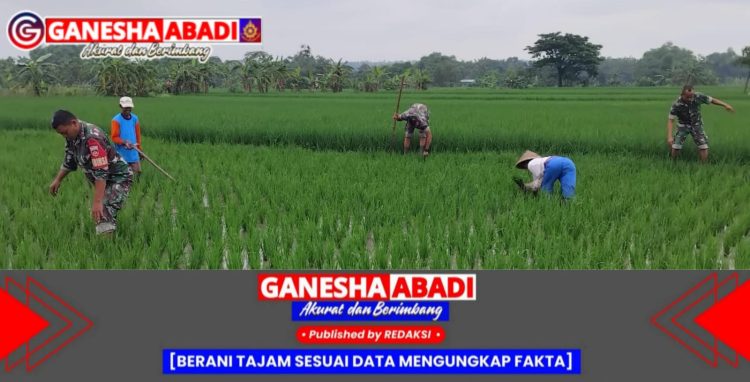 Sragen – Babinsa Koramil 18/Kalijambe Kodim 0725/Sragen, Serka Heriyanto, turun langsung ke sawah membantu petani menyiangi rumput liar di lahan milik Bp. Salomo, anggota Kelompok Tani (Poktan) Alam Hijau, Dukuh Karanganyar, RT 17, Desa Ngebung, Kecamatan Kalijambe, Rabu (2/4/2025).