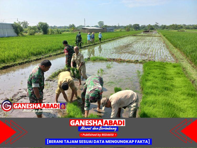 Boyolali — Babinsa Koramil 09/Sawit Kodim 0724/Boyolali turun langsung ke sawah mendampingi petani menanam padi di Desa Gombang, Kecamatan Sawit, Boyolali, Rabu (16/7/2025).