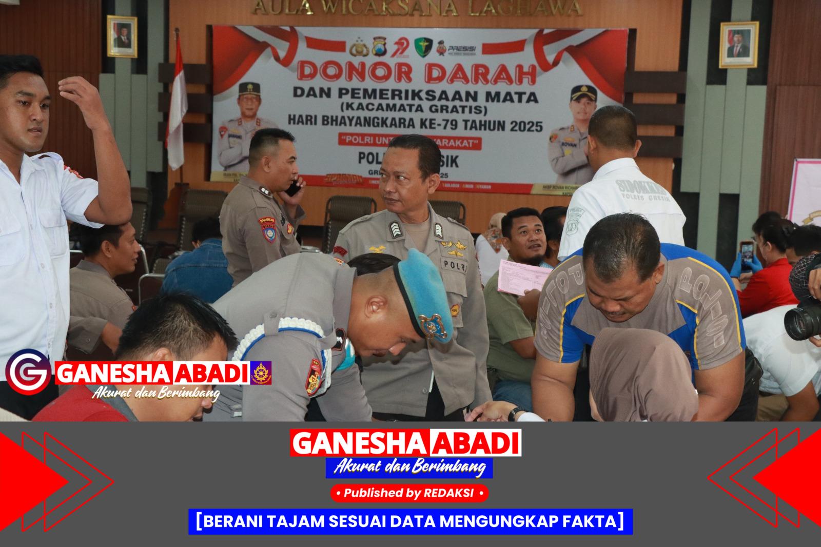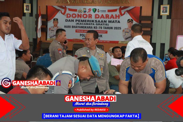Gresik– Menyambut Hari Bhayangkara ke-79, Polres Gresik menggelar bakti sosial kemanusiaan yang menyentuh langsung kebutuhan masyarakat. Kegiatan yang digelar di Aula Wicaksana Legawa, Selasa (17/6/2025), meliputi donor darah dan pemeriksaan mata gratis dengan pembagian kacamata baca.