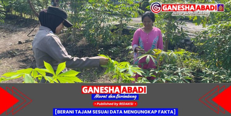 Didampingi pemilik lahan dan warga sekitar, Brigadir Dwi Retno memantau kondisi tanaman singkong yang ditanam di pekarangan warga. Kegiatan ini sekaligus menjadi ajakan kepada masyarakat untuk memanfaatkan lahan produktif di lingkungan mereka.