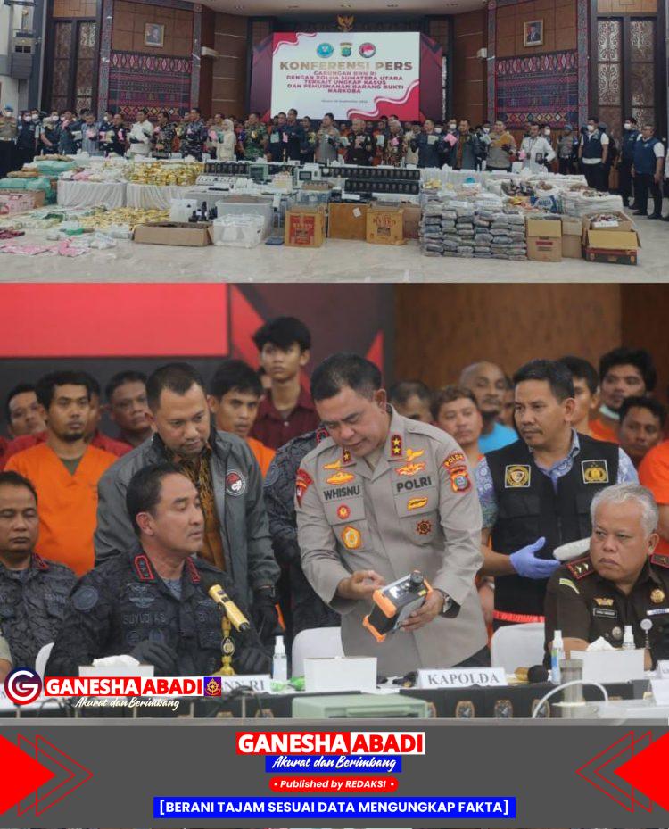 Medan — Badan Narkotika Nasional (BNN) RI bersama Polda Sumut berhasil mengungkap kasus besar narkotika dengan total barang bukti 1,7 ton. Barang bukti yang disita terdiri dari sabu, ekstasi, kokain, ganja, happy five, dan jenis narkotika lainnya.