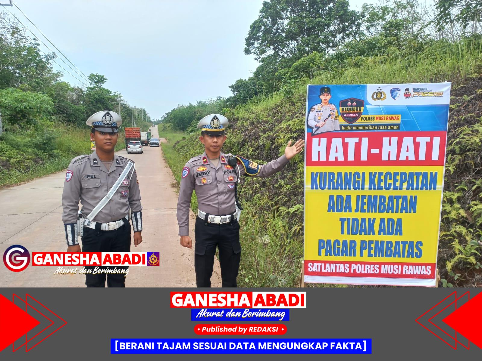 Cegah Laka Tunggal, Satlantas Polres Musi Rawas Pasang Spanduk Peringatan di Jembatan Tanpa Pembatas
