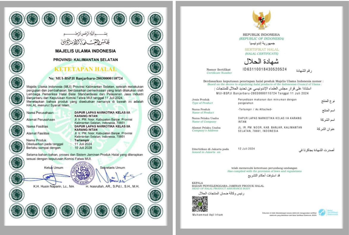 KARANG INTAN – Dapur Lembaga Pemasyarakatan (Lapas) Narkotika Kelas IIA Karang Intan raih sertifikat halal dari Badan Penyelenggara Jaminan Produk Halal Kementerian Agama Republik Indonesia (Kemenag RI), untuk penyelenggara makanan dan minuman dengan pengolahan. Semua produk makanan dan minuman dapur Lapas ditetapkan halal oleh Majelis Ulama Indonesia (MUI) Kalimantan Selatan, berdasarkan hasil pemeriksaan kehalalan produk yang dilakukan Lembaga Pemeriksa Halal (LPH) Balai Standarisasi dan Pelayanan Jasa Industri (BSPJI) Banjarbaru.