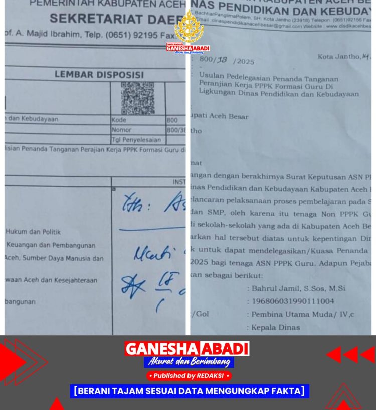 Selain dugaan maladministrasi, beredar pula surat pendelegasian dari Disdik Aceh Besar yang diteken oleh Sekretaris Dinas Fahrurrazi, SE, tertanggal 14 Januari 2025. Dalam surat itu, disebutkan bahwa Pj Bupati Aceh Besar diminta untuk mendelegasikan atau memberikan kuasa penandatanganan Perjanjian Kerja Tahun 2025 bagi tenaga ASN PPPK guru kepada Kepala Dinas, Bahrul Jamil, S.Sos., M.Si.