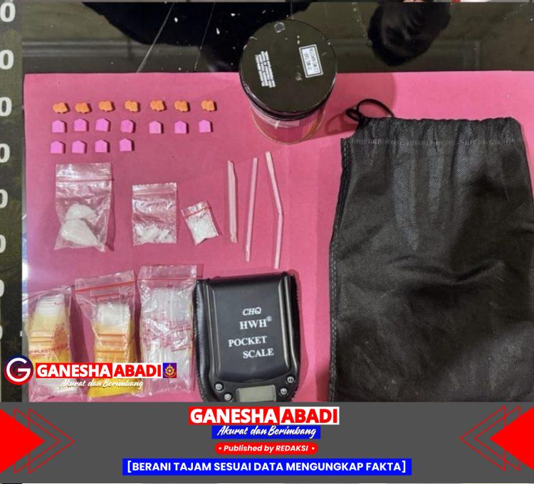 “saat penggeledahan ditemukan sabu seberat bruto 8,84 gram, tujuh butir ekstasi oranye berlogo TMT seberat 3,24 gram, dan 11 butir ekstasi merah muda berlogo TMT dengan berat 5,14 gram,” jelas AKP Aston.