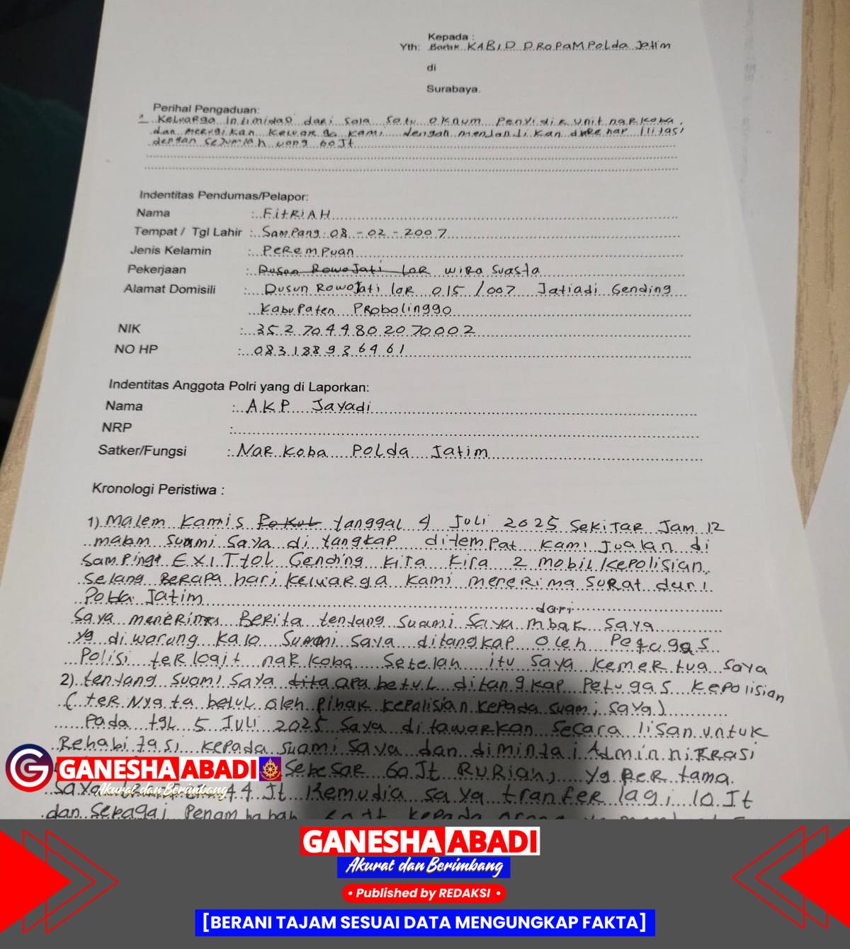 AM, yang ditangkap pada 4 Juli 2025 di Exit Tol Gending, Kabupaten Mojokerto, dituduh terlibat dalam pengedaran narkoba. Suami Ft tersebut ditahan di Polda Jawa Timur, dan Ft berharap suaminya bisa direhabilitasi. Namun, saat mencari solusi, Ft ditawari oleh seorang pria yang mengaku dapat membantu rehabilitasi suaminya. Oknum tersebut, yang mengaku berasal dari Polda Jawa Timur, meminta uang sekitar Rp 60 juta untuk proses rehabilitasi tersebut.