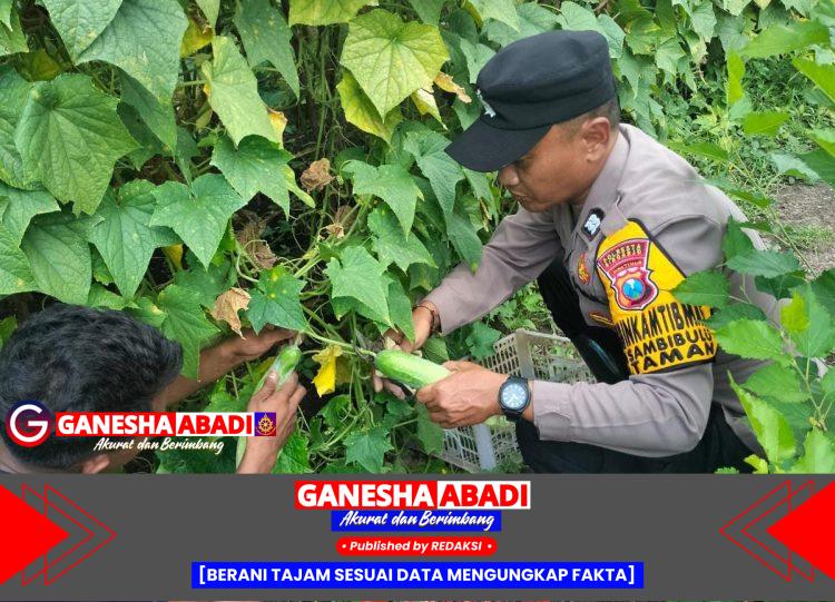 Tak hanya melakukan pengecekan, Aiptu Choirul bersama para petani juga melaksanakan panen sayur timun di pekarangan rumah Bapak Irdoni yang terletak di Dusun Sambiroto RT 13 RW 03 Desa Sambibulu. Tanaman yang tumbuh subur ini menjadi bukti nyata bahwa pekarangan rumah pun dapat menjadi sumber pangan bergizi jika dikelola dengan baik.