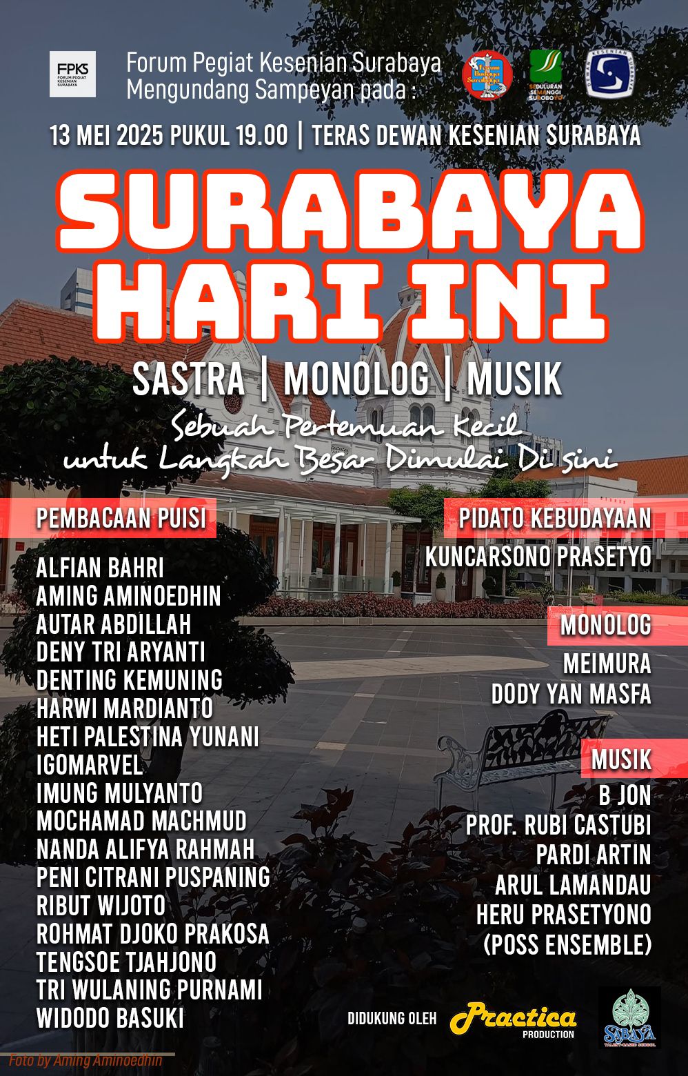 Monolog akan dibawakan oleh Meimura dan Dody Yan Masfa. Sementara itu, pidato kebudayaan bertema “Surabaya Hari Ini” akan disampaikan oleh Kuncarsono Prasetyo dari komunitas Begandring.