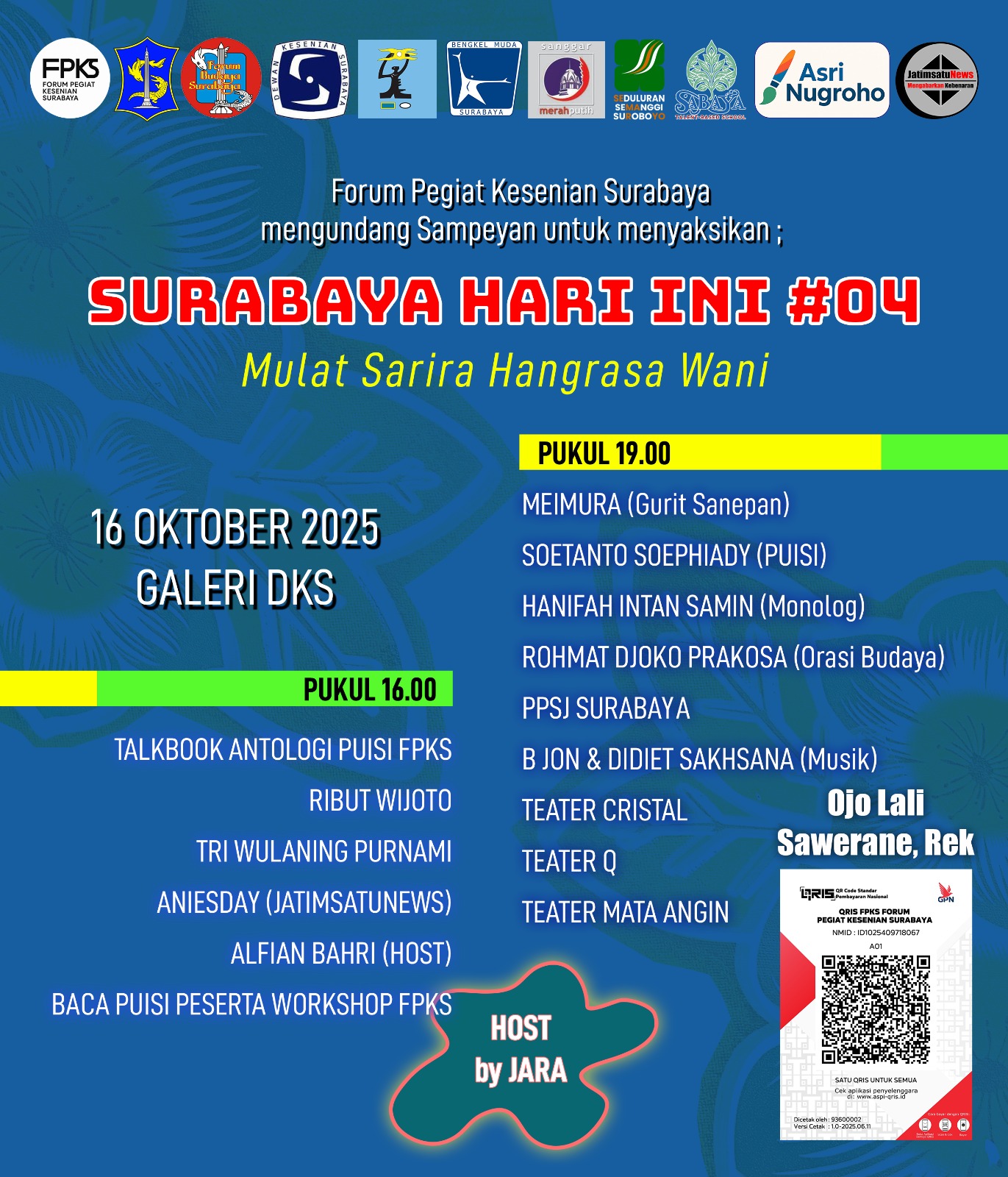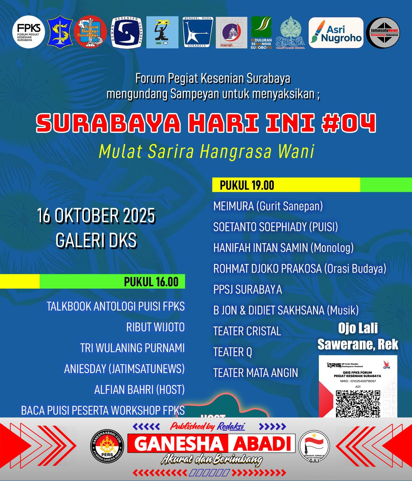 Surabaya – Setelah absen selama dua bulan, Forum Pegiat Kesenian Surabaya (FPKS) kembali menyelenggarakan program “Surabaya Hari Ini” pada Rabu, 16 Oktober 2025, di Galeri Dewan Kesenian Surabaya, Kompleks Balai Pemuda, Jalan Gubernur Suryo 15 Surabaya.