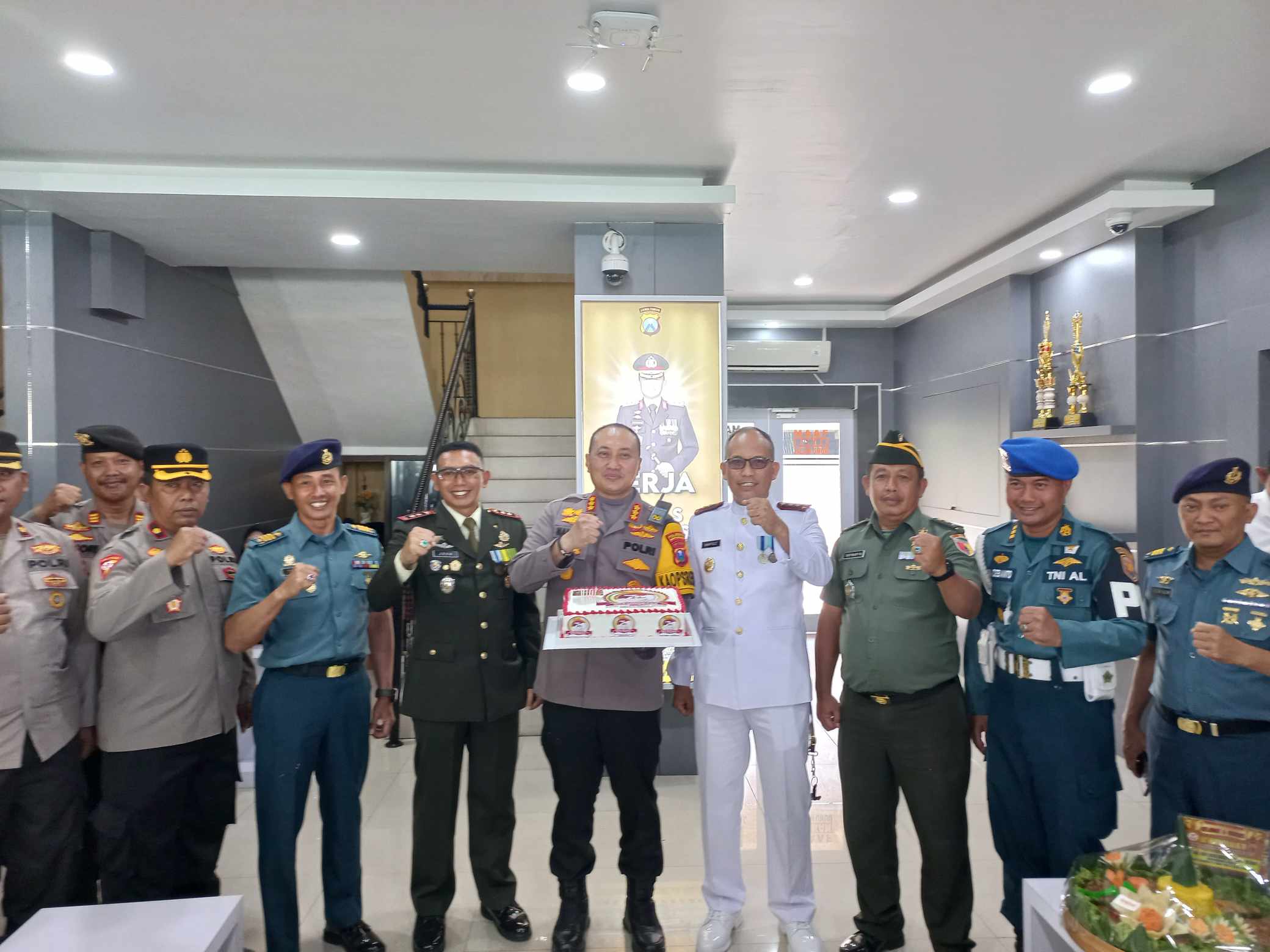 Kedatangan Dandim 0825/Banyuwangi bersama Anggota Lanal Banyuwangi dan Kodim 0825/ Banyuwangi yang tidak di beritahukan sebelumnya kepada Kapolres Banyuwangi untuk memberikan Surprise kepada Kapolres dan memberikan ucapan selamat HUT Bhayangkara ke-78, Semoga “Polri yang Presisi menuju Indonesia Emas Transformasi Ekonomi Yang Inklusif dan Berkelanjutan”.