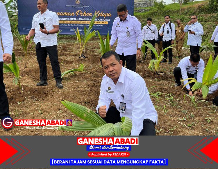 Malang – Kementerian Imigrasi dan Pemasyarakatan (Kemenimipas) menggelar penanaman bibit pohon kelapa secara serentak di seluruh Indonesia dalam rangka mendukung program ketahanan pangan nasional, Selasa (9/9/2025). Kegiatan pusat digelar di Nusakambangan, sementara di Jawa Timur dipusatkan di lahan Sarana Asimilasi dan Edukasi (SAE) Lapas Kelas I Malang, Ngajum, Kabupaten Malang.