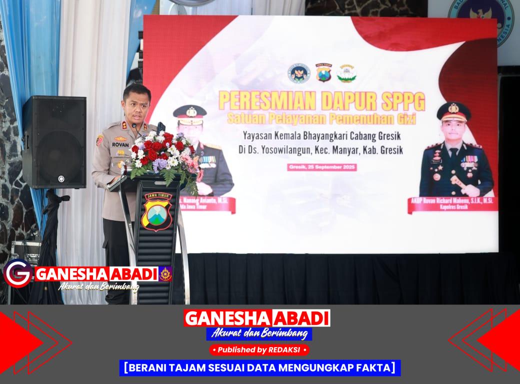 Kapolres Gresik AKBP Rovan Richard Mahenu menyampaikan apresiasi atas dukungan berbagai pihak dalam pembangunan fasilitas dapur gizi. Ia menjelaskan, SPPG berdiri di atas lahan seluas 426,5 meter persegi dan ditargetkan melayani 3.452 penerima manfaat, mencakup 13 sekolah, 16 posyandu, serta kelompok ibu hamil dan menyusui, dengan dukungan 47 relawan.