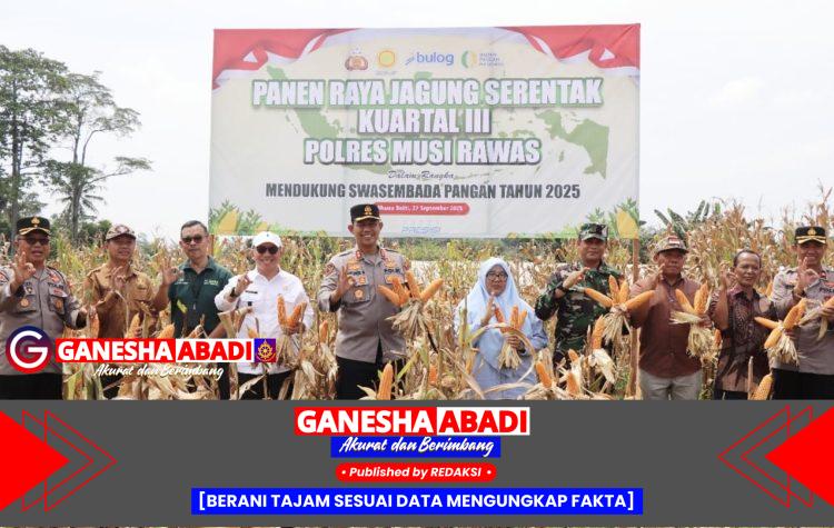Musi Rawas – Kapolres Musi Rawas (Mura), AKBP Agung Adhitya Prananta SH, SIK, MH, bersama Forkompinda menggelar Panen Raya Jagung Serentak Kuartal III di Dusun 7, Desa Suro, Kecamatan Muara Beliti, Kabupaten Mura, Sabtu (27/9/2025). Kegiatan ini dilaksanakan dalam rangka mendukung Program Asta Cita Presiden RI menuju swasembada pangan 2025.