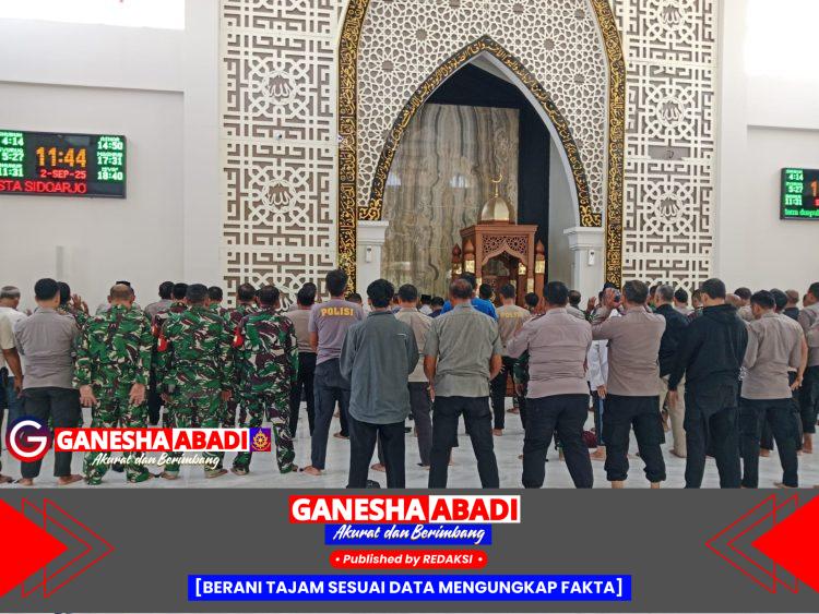 Sidoarjo – Di tengah pengamanan aksi penyampaian pendapat di Mako Polresta Sidoarjo, Selasa (2/9/2025), suasana kebersamaan tercipta ketika anggota Polri, TNI, mahasiswa, dan masyarakat melaksanakan Shalat Duhur berjamaah di Masjid Al Ikhlas.