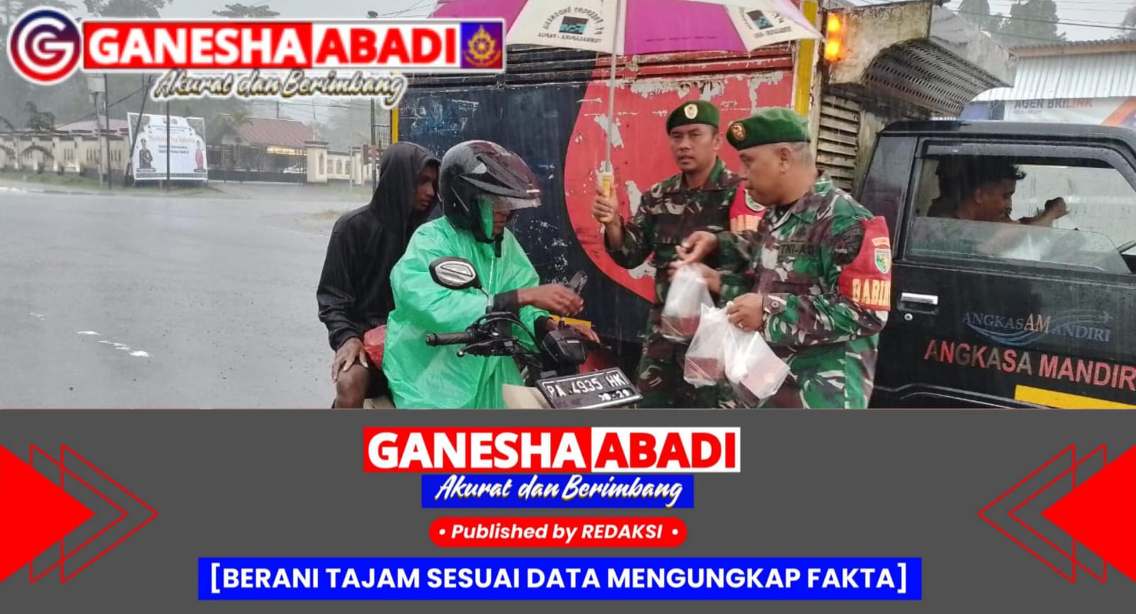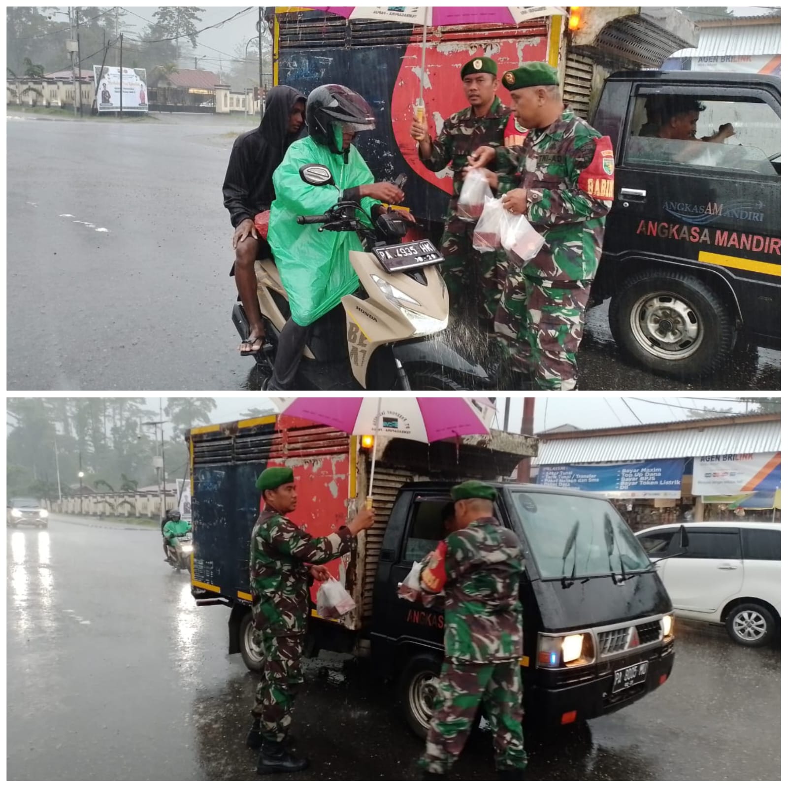Timika – Dalam rangka mengisi bulan suci Ramadan dengan kegiatan positif, Koramil 1710-03/Kuala Kencana menggelar aksi berbagi takjil kepada masyarakat di sekitar perempatan Kuala Kencana, Distrik Kuala Kencana, Kabupaten Mimika, Sabtu (08/03/2025).