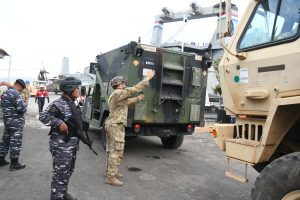 BANYUWANGI – Prajurit Pangkalan TNI Angkatan Laut (Lanal) Banyuwangi kembali bertugas mengamankan kegiatan embarkasi material dan alutsista milik US Army di Pelabuhan Tanjung Wangi Jl. Raya Situbondo Ketapang Banyuwangi. Kegiatan ini merupakan tindak lanjut dari suksesnya pelaksanaan Latihan Gabungan Bersama (Latgabma) Super Garuda Shield (SGS) 2024 yang telah dilaksanakan di wilayah Kabupaten Banyuwangi dan Situbondo. Kamis (12/09/2024).