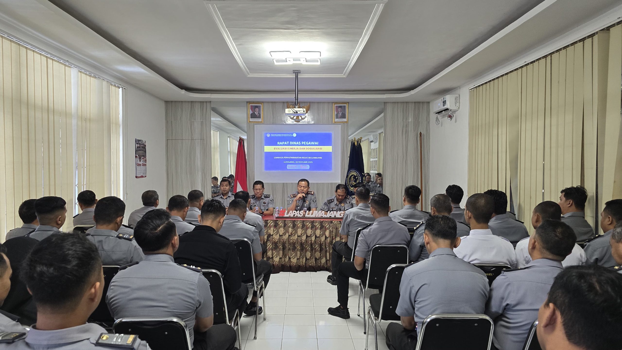 Lumajang, 19 Februari 2025 – Lembaga Pemasyarakatan (Lapas) Kelas IIB Lumajang menggelar rapat dinas di Aula Wiraradja pada Senin pagi. Rapat ini dipimpin langsung oleh Kepala Lapas Lumajang, Mahendra Sulaksana, dan dihadiri oleh seluruh petugas lapas.
