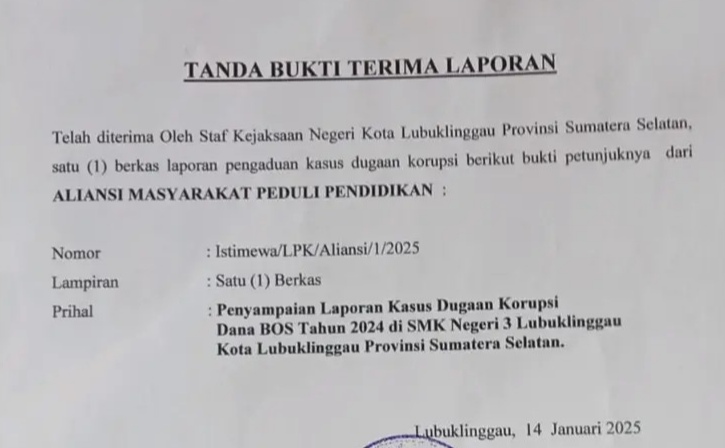 Lubuklinggau – Lembaga Pemerhati Pembangunan Daerah (P2D) resmi melaporkan dugaan kasus Korupsi, Kolusi, dan Nepotisme (KKN) di SMKN 3 Kota Lubuklinggau ke Kejaksaan Negeri Lubuklinggau pada Selasa, 14 Januari 2025.
