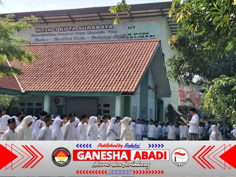 Surabaya, 22 Oktober 2025 – MTsN 3 Kota Surabaya menggelar apel peringatan Hari Santri Nasional di halaman madrasah dengan penuh khidmat dan semangat kebangsaan. Kegiatan diikuti seluruh siswa kelas VII dan VIII, dewan guru, serta tenaga kependidikan. Peserta mengenakan busana muslim putih; putra memakai sarung dan peci, sedangkan putri mengenakan gamis dan kerudung putih.