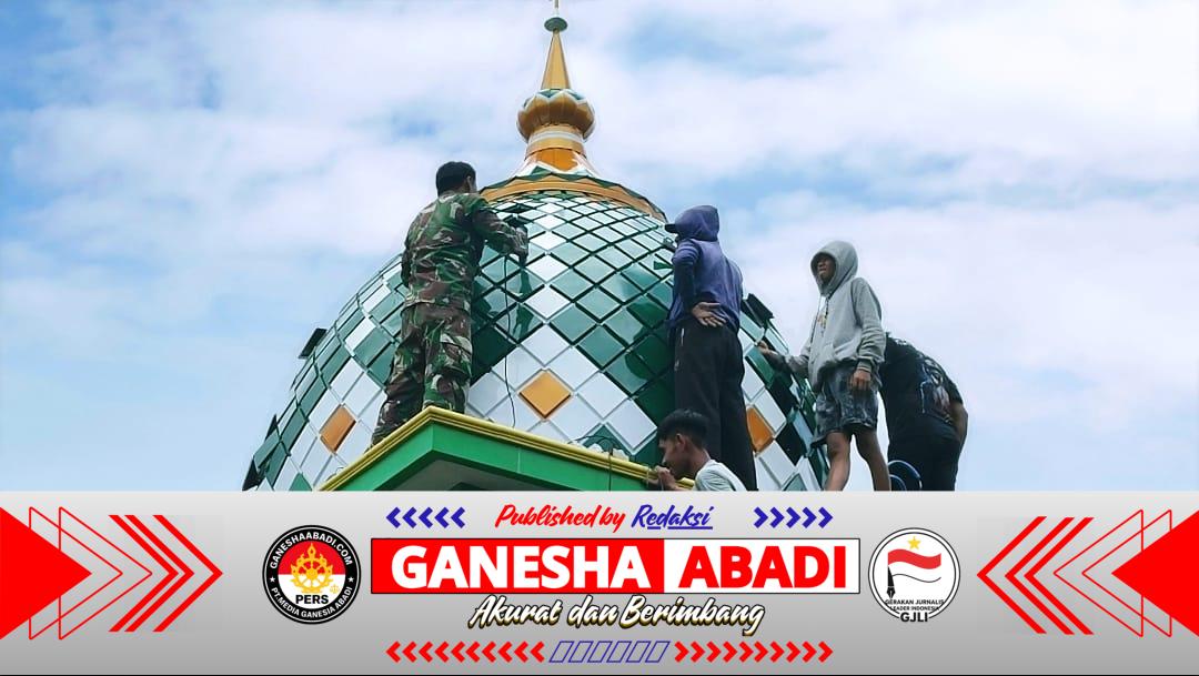 Proses pemasangan kubah dilakukan dengan penuh kehati-hatian dan gotong royong. Sejumlah prajurit TNI bekerja sama dengan warga menaikkan kubah menggunakan tangga. Sementara di bagian bawah, warga lain ikut membantu menyiapkan bagian yang lain serta memastikan setiap tahap berjalan aman dan lancar. Suasana kerja penuh semangat dan canda tawa membuat kegiatan tersebut terasa hangat di tengah teriknya sinar matahari.