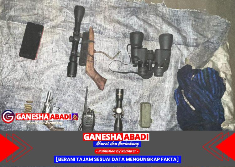 Dari lokasi kejadian, aparat menyita sejumlah barang bukti seperti satu pucuk pistol revolver, satu pistol rakitan, lima butir amunisi kaliber 9 mm, satu HT, satu handphone, teleskop optik, dan satu alat pengukur jarak Leica 1000 YDSAT.