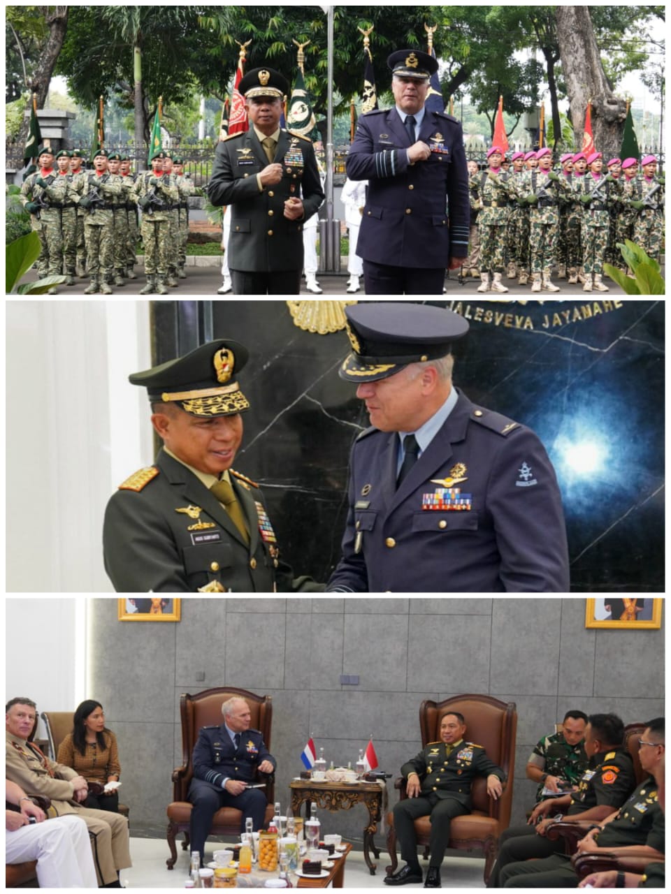Jakarta – Panglima TNI Jenderal TNI Agus Subiyanto menerima kunjungan kehormatan (courtesy call) dari Panglima Angkatan Bersenjata Belanda, General Onno Eichelsheim, beserta delegasi, di Kantor Subden Mabes TNI, Jakarta Pusat, Senin (2/6/2025). Kunjungan ini diawali dengan jajar pasukan dan upacara kehormatan.