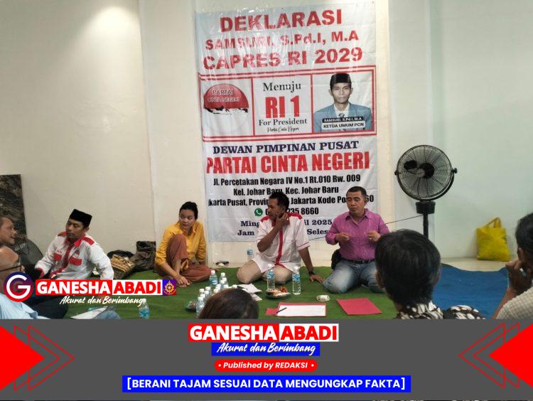 Jakarta – Partai Cinta Negeri (PCN) resmi mendeklarasikan Ketua Umumnya, Samsuri, S.Pd.I., M.A., sebagai Calon Presiden Republik Indonesia untuk periode 2029–2034. Deklarasi tersebut berlangsung pada Minggu, 27 April 2025, di Ruang Pertemuan DPP PCN, Jalan Percetakan Negara IV No.1, Kelurahan Johar Baru, Kecamatan Johar Baru, Jakarta Pusat.