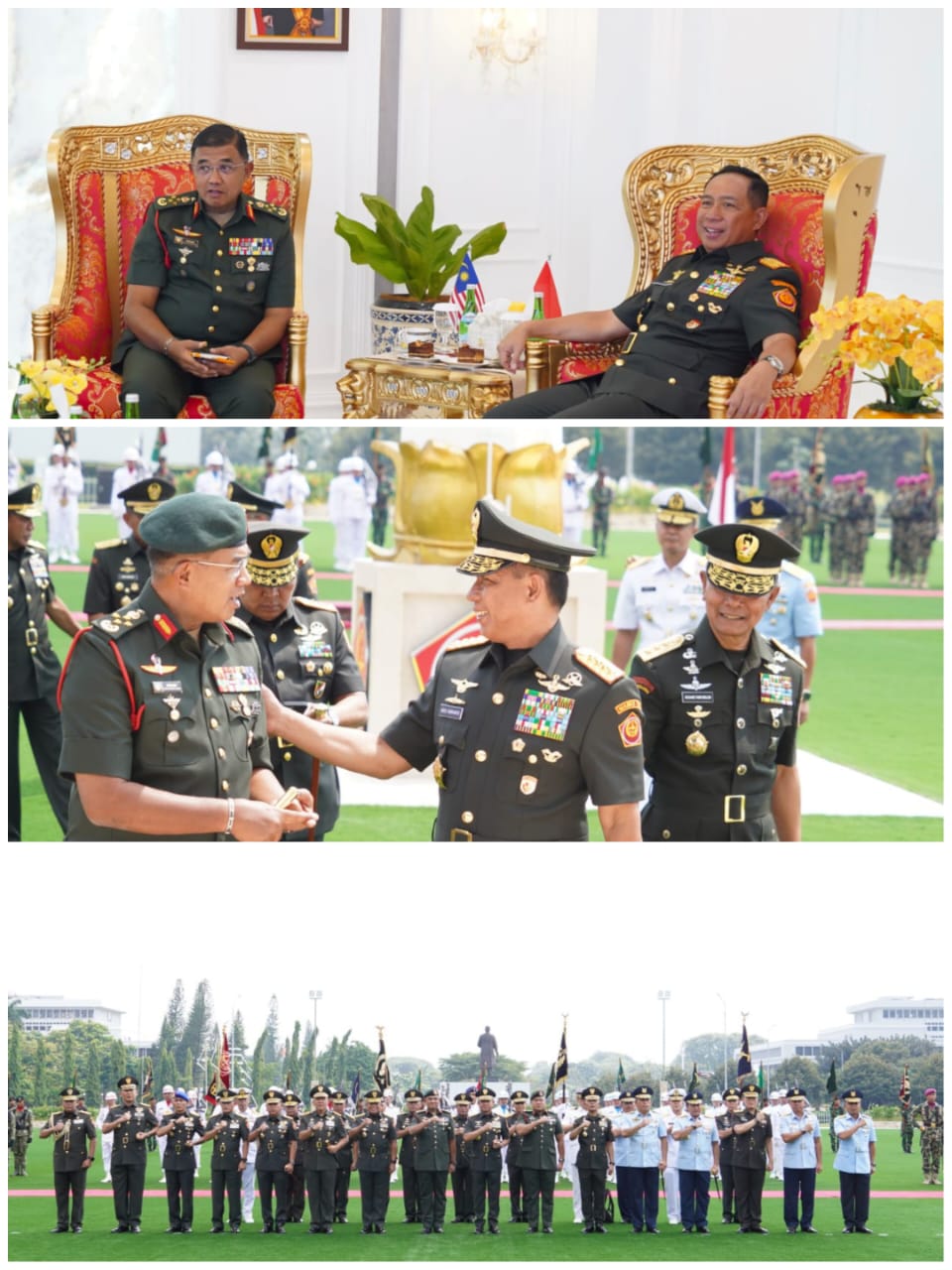 Jakarta – Panglima TNI Jenderal TNI Agus Subiyanto menerima kunjungan kehormatan (Courtesy Call/CC) dari Panglima Angkatan Tentera Malaysia (PAT) Jeneral Datuk HJ Mohd Nizam Bin HJ Jafar, yang turut didampingi oleh sejumlah pejabat utama ATM. Pertemuan berlangsung di Markas Besar TNI, Cilangkap, Jakarta Timur, Rabu (16/04/2025), diawali dengan upacara penyambutan dan jajar kehormatan.