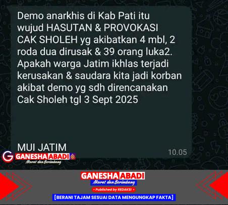 “Demo anarkhis di Kab Pati itu wujud HASUTAN & PROVOKASI CAK SHOLEH yg akibatkan 4 mbl, 2 roda dua dirusak & 39 orang luka2. Apakah warga Jatim ikhlas terjadi kerusakan & saudara kita jadi korban akibat demo yg sdh direncanakan Cak Sholeh tgl 3 Sept 2025 — MUI JATIM”