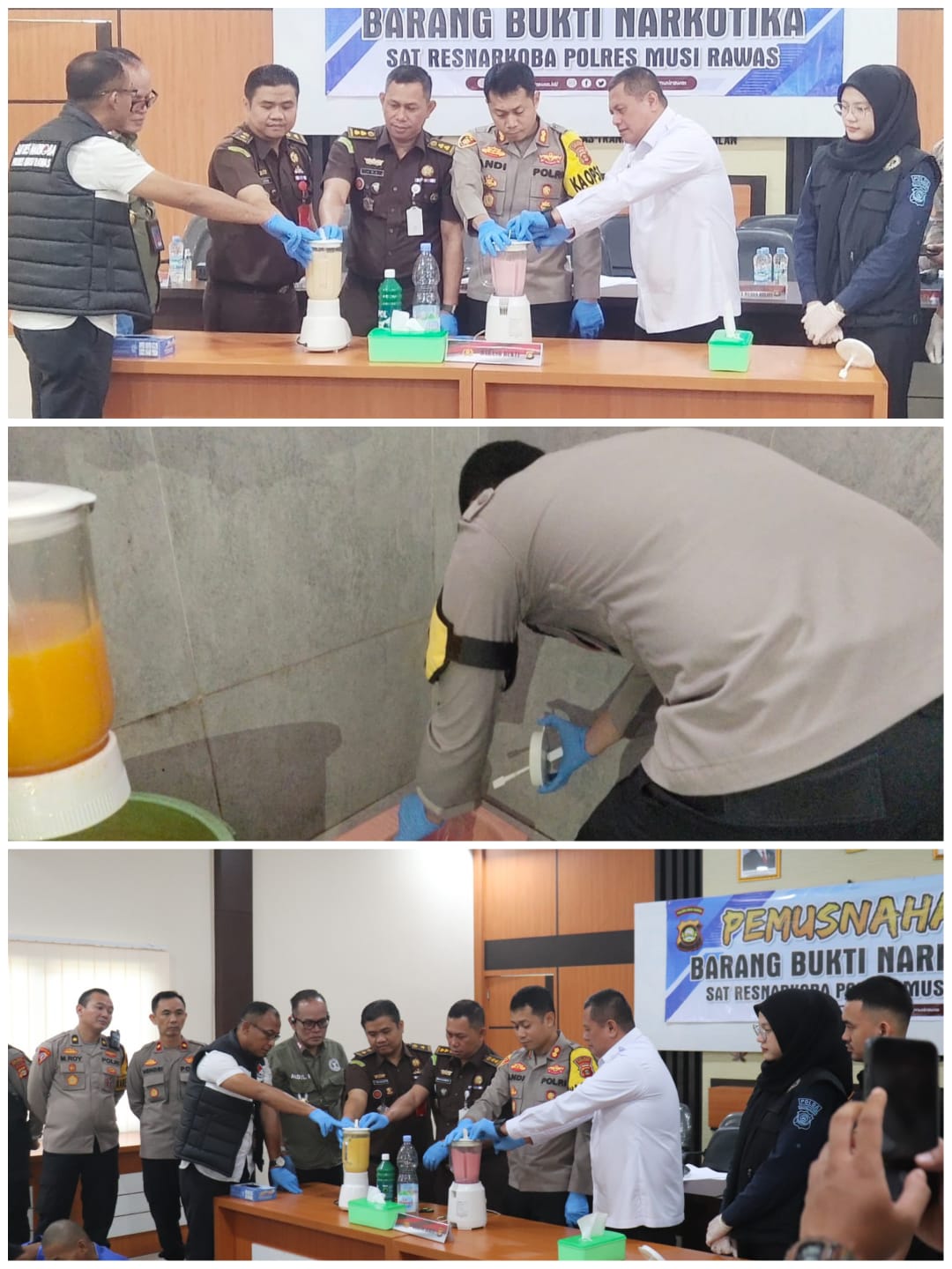 Proses pemusnahan dilakukan dengan cara diblender, dicampur cairan pembersih lantai, lalu dibuang ke kloset toilet Mapolres Mura.