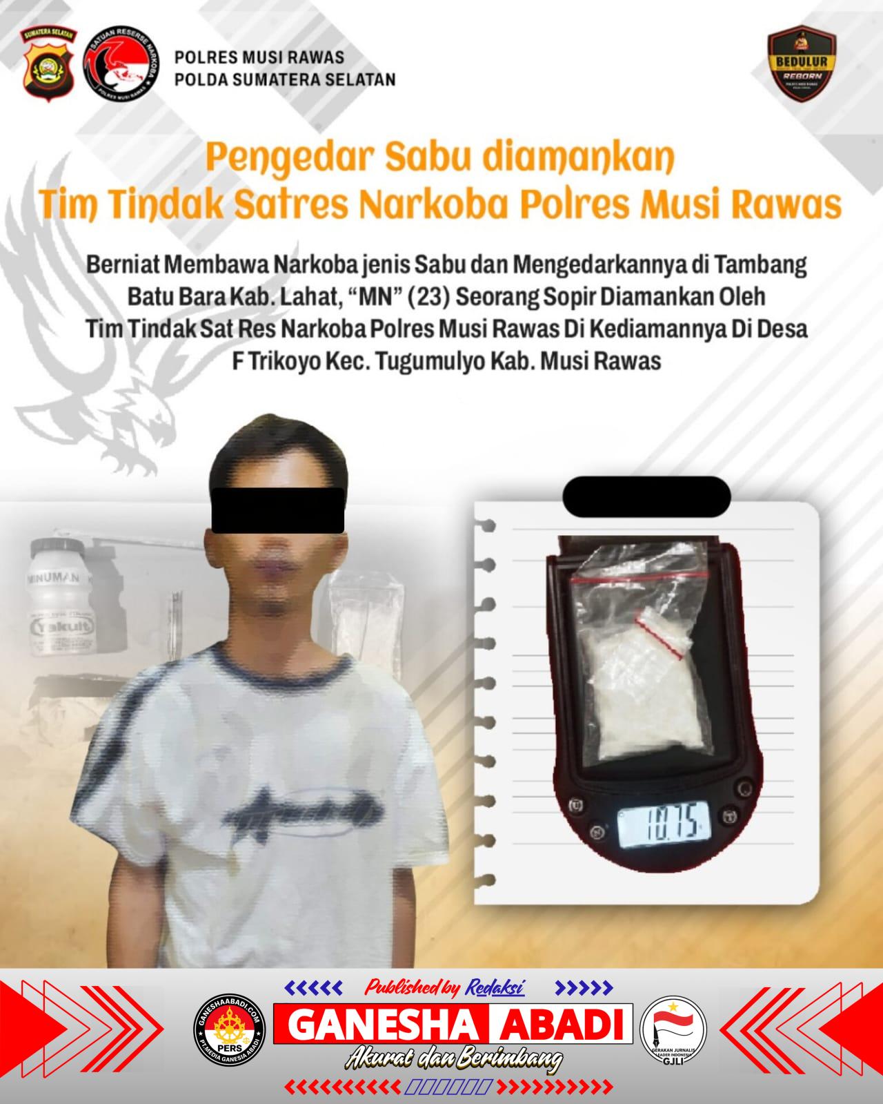 Kapolres Musi Rawas AKBP Agung Adhitya Prananta SH, SIK, MH, didampingi Kasat Res Narkoba IPTU Jemmy Amin Gumayel, membenarkan adanya penangkapan terhadap pelaku berinisial MN (22) yang diduga kuat terlibat dalam peredaran narkotika jenis sabu.