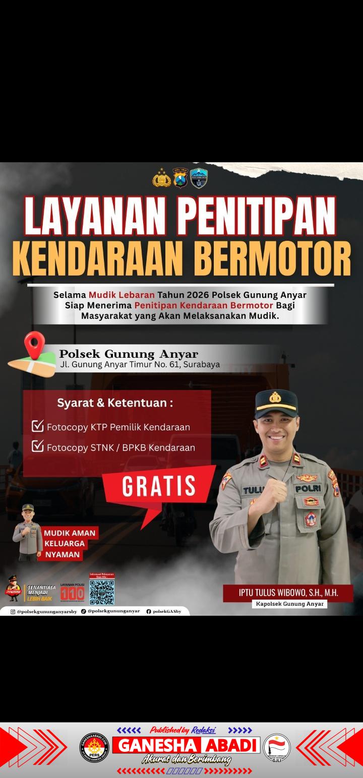 SURABAYA -Dalam rangka memberikan rasa aman dan nyaman kepada masyarakat yang akan melaksanakan mudik Lebaran, Polsek Gunung Anyar membuka layanan penitipan kendaraan roda dua secara gratis bagi warga.