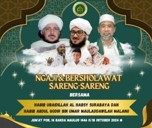 “Pengaosan dan bersholawat Selapan Sabtu Wage dalam rangka HSN (Hari Santri Nasional) menghadirkan penceramah oleh Habib Ubaidillah Al Habsy dari Surabaya. Dan bersholawat akan bersama Habib Abdul Qodir Bin Umar Mauladdawilah dari Malang. Pengaosan dan bersholawat Selapan Sabtu Wage untuk umum. Karena itu dapat dihadiri oleh para jama’ah,” jelasnya.