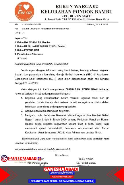 Jakarta – Rencana peresmian Gereja Bethel Indonesia (GBI) di kawasan Apartemen Casablanca East Residence (CER), Pondok Bambu, Jakarta Timur, mendapat penolakan dari puluhan warga RW 02. Penolakan tersebut disampaikan secara resmi melalui Surat Dukungan Penolakan yang ditandatangani perwakilan tokoh masyarakat dan pengurus lingkungan.