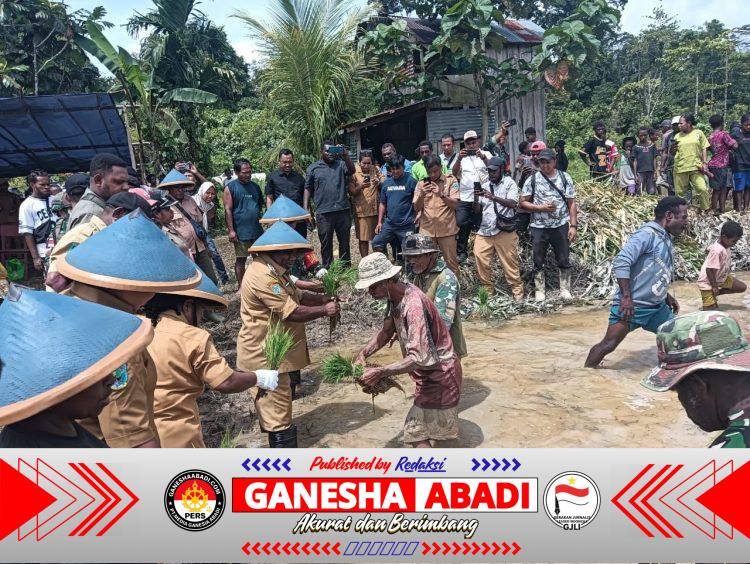 Selain penyuluhan, personel Satgas TMMD turut terlibat langsung membantu proses penanaman padi bersama kelompok tani. Suasana kebersamaan dan gotong royong antara TNI dan masyarakat tampak nyata, mencerminkan semangat kemanunggalan TNI dengan rakyat yang menjadi ciri khas kegiatan TMMD di Kabupaten Tambrauw.