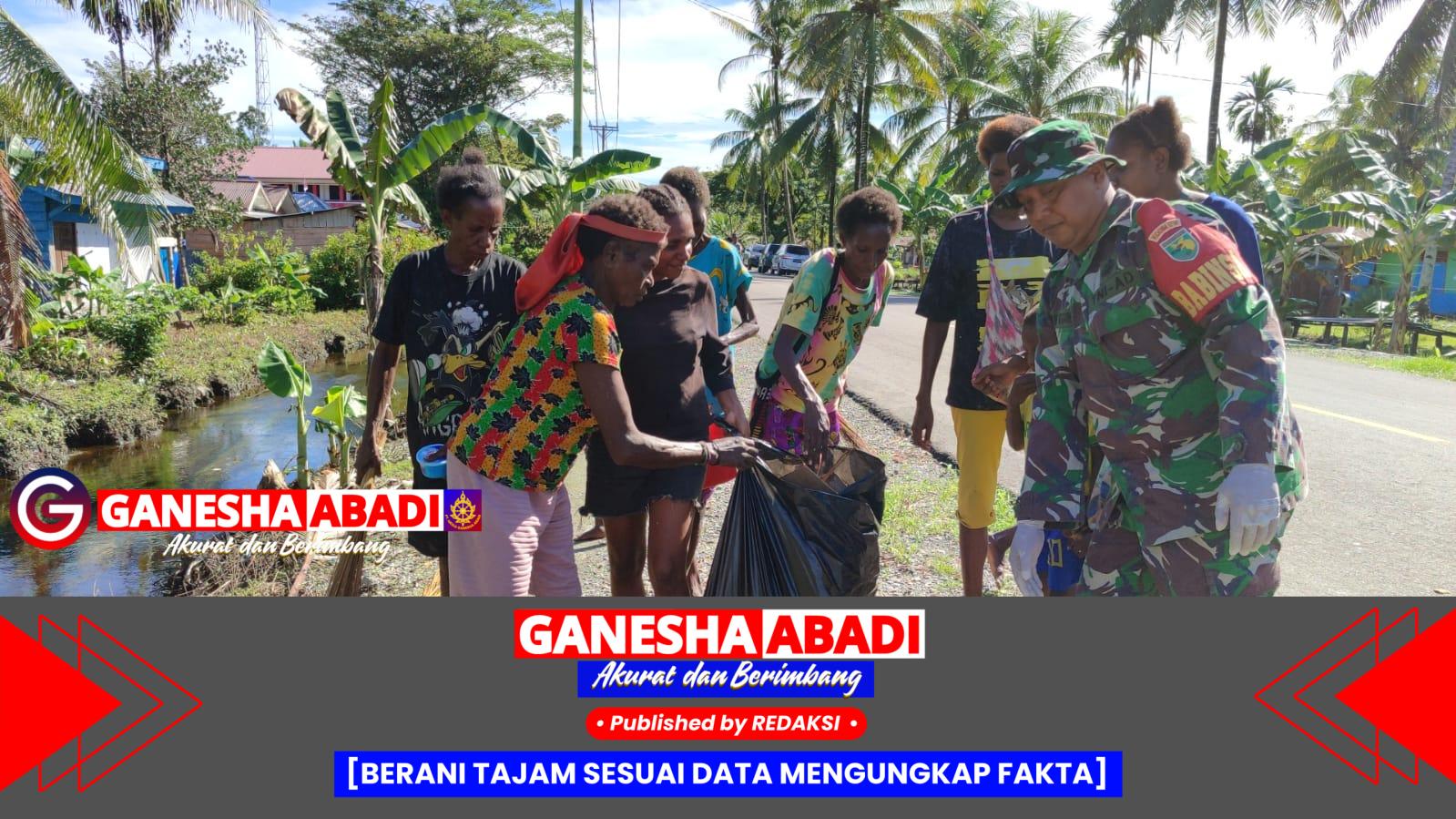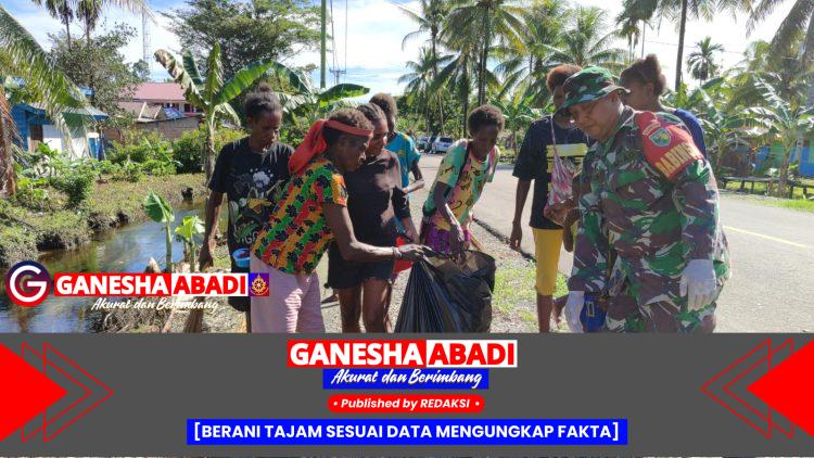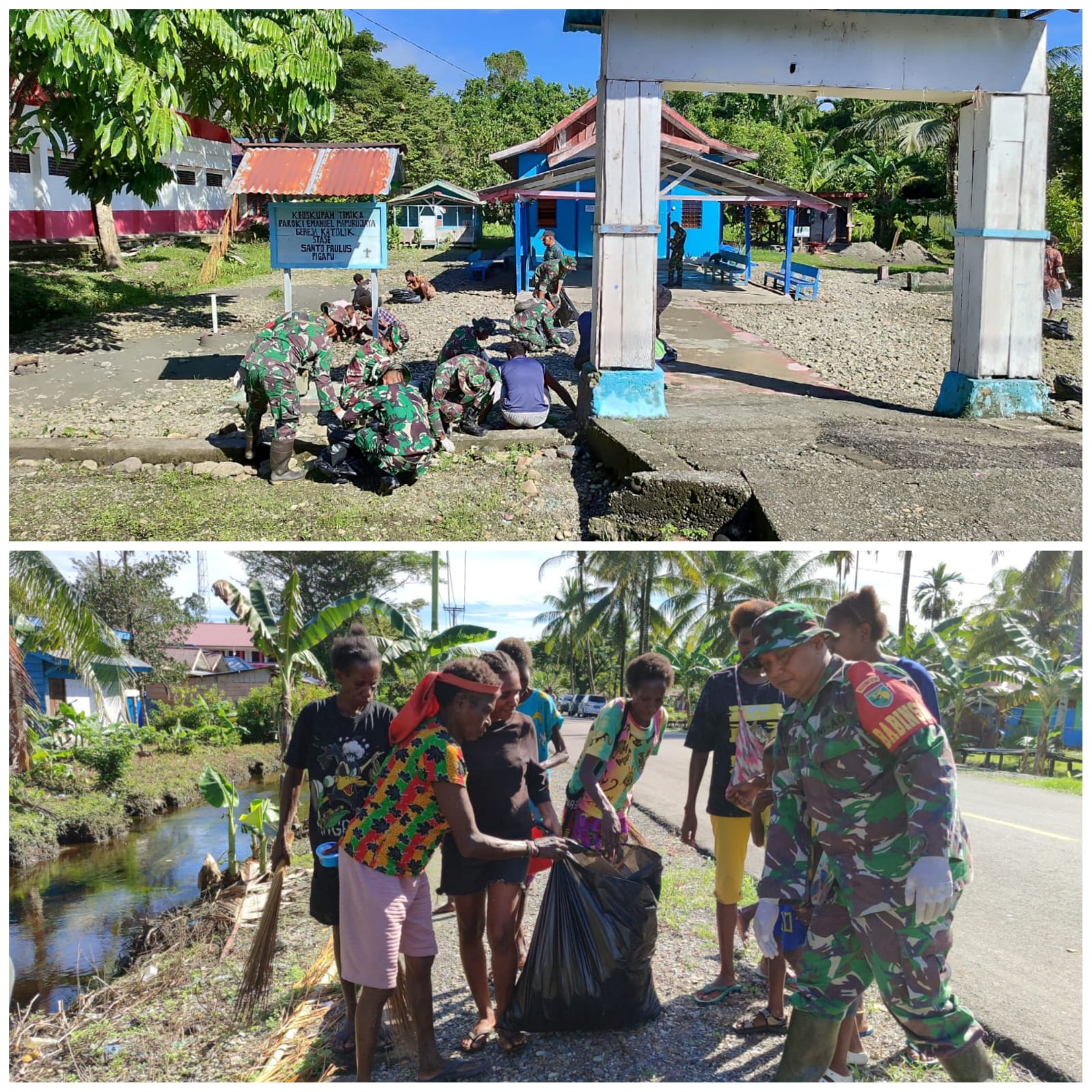 Timika – Satgas TNI Manunggal Membangun Desa (TMMD) Kodim 1710/Mimika bersama warga Kampung Pigapu, Distrik Iwaka, Kabupaten Mimika, melaksanakan aksi bersih lingkungan di sekitar lokasi TMMD Reguler ke-124, Rabu (21/5/2025).