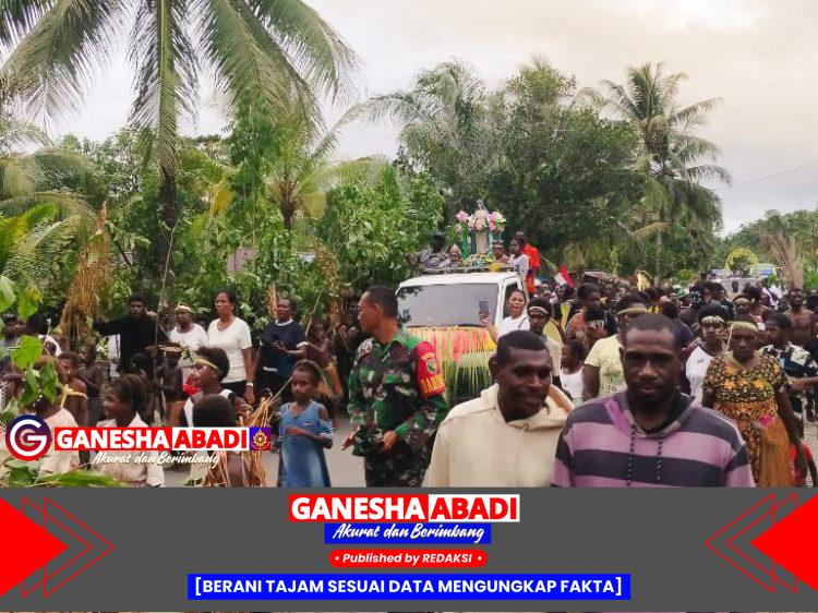 Timika – Suasana penuh sukacita dan kebersamaan tampak menyelimuti Kampung Pigapu saat ratusan umat mengikuti arak-arakan Patung Bunda Maria dalam rangka perayaan Bulan Maria, Sabtu (10/5/2025). Menariknya, Satgas TNI Manunggal Membangun Desa (TMMD) ke-124 Kodim 1710/Mimika turut ambil bagian dalam kegiatan ini.