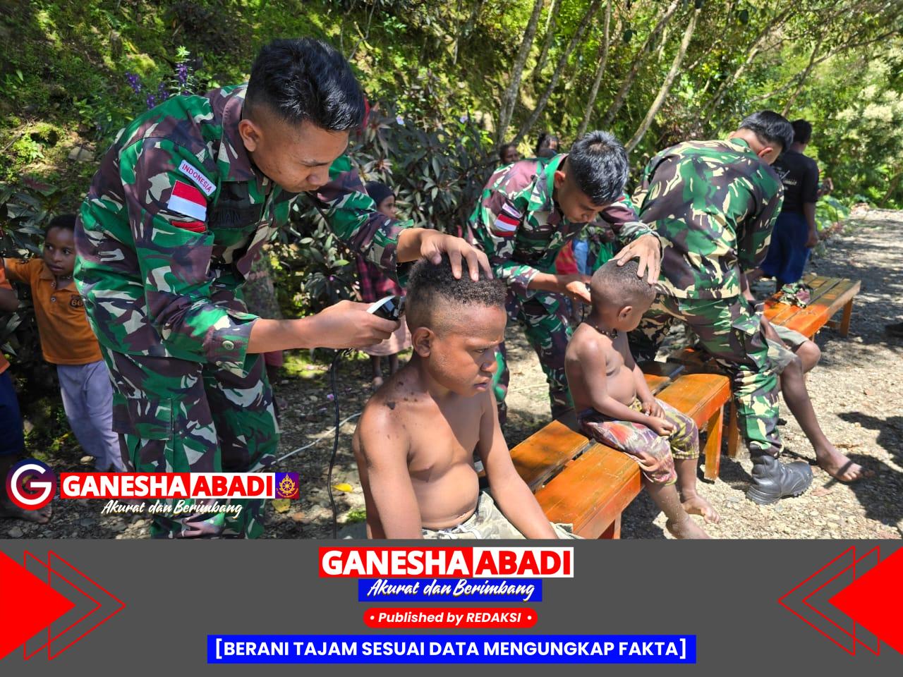 Puncak Jaya – Dalam upaya mempererat hubungan dengan masyarakat perbatasan, Satgas Pamtas Kewilayahan Yonif 715/Motuliato memberikan layanan potong rambut gratis dan gunting kuku kepada warga Distrik Yambi, Kabupaten Puncak Jaya, Papua, Selasa (6/5/2025).