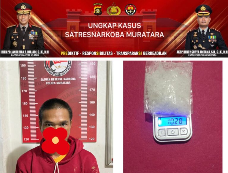 MUSI RAWAS UTARA, SUMATERA SELATAN — Satuan Reserse Narkoba Polres Musi Rawas Utara (Muratara) berhasil menangkap seorang terduga pengedar narkotika jenis sabu bernama Muhammad Yani (38), warga Dusun II Desa Beringin Makmur II, Kecamatan Rawas Ilir, Kabupaten Musi Rawas Utara, Sumatera Selatan.