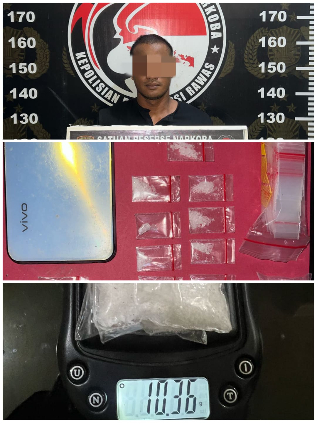 Dari hasil penggeledahan, ditemukan 12 bungkus plastik klip bening berisi kristal putih diduga sabu—terdiri dari 11 bungkus kecil dan 1 bungkus sedang—dengan berat bruto total 9,95 gram. Selain itu, petugas juga menemukan satu bungkus kecil lainnya seberat 0,41 gram dalam sebuah dompet coklat di atas papan dekat langit-langit rumah. Total barang bukti sabu yang diamankan mencapai 10,36 gram.