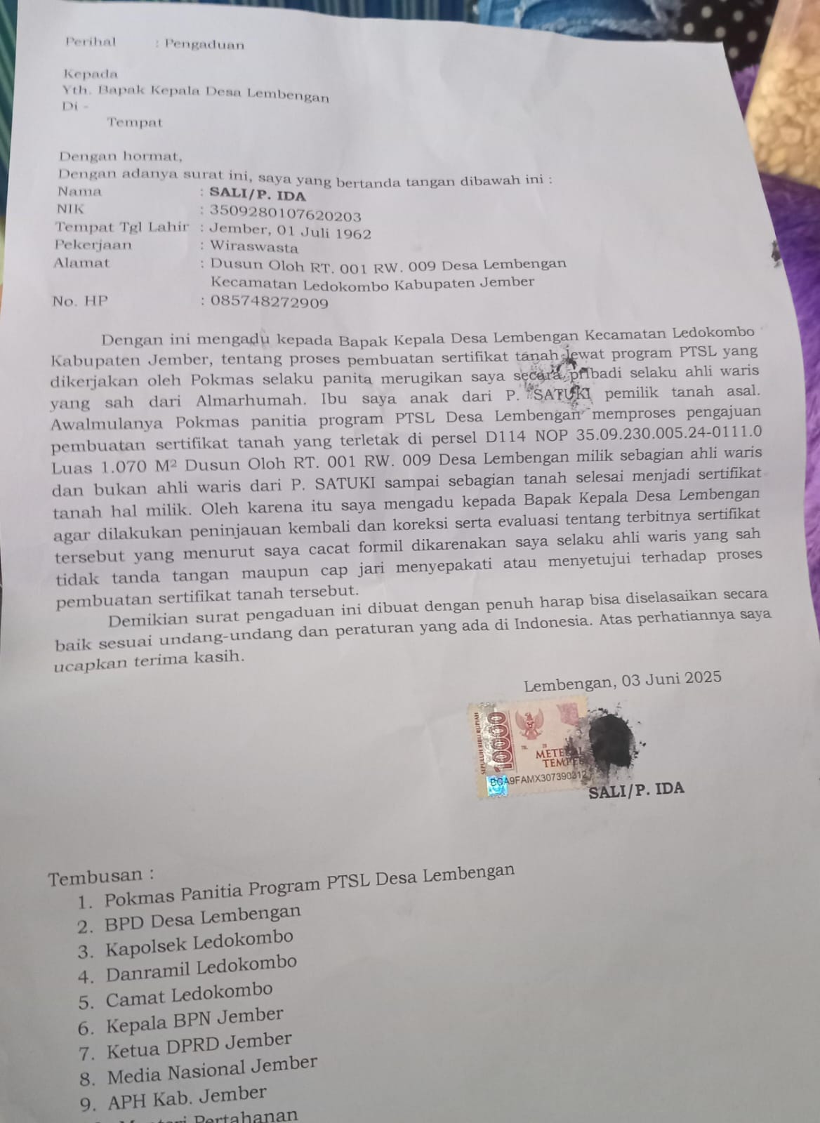 Jember – Sengketa tanah di Desa Lembengan, Kecamatan Ledokombo, Kabupaten Jember, kembali mencuat. Sali, ahli waris dari almarhum P. Satuki, melaporkan Kelompok Masyarakat (Pokmas) Desa Lembengan ke aparat penegak hukum karena diduga tidak menjalankan proses Pendaftaran Tanah Sistematis Lengkap (PTSL) sesuai ketentuan.