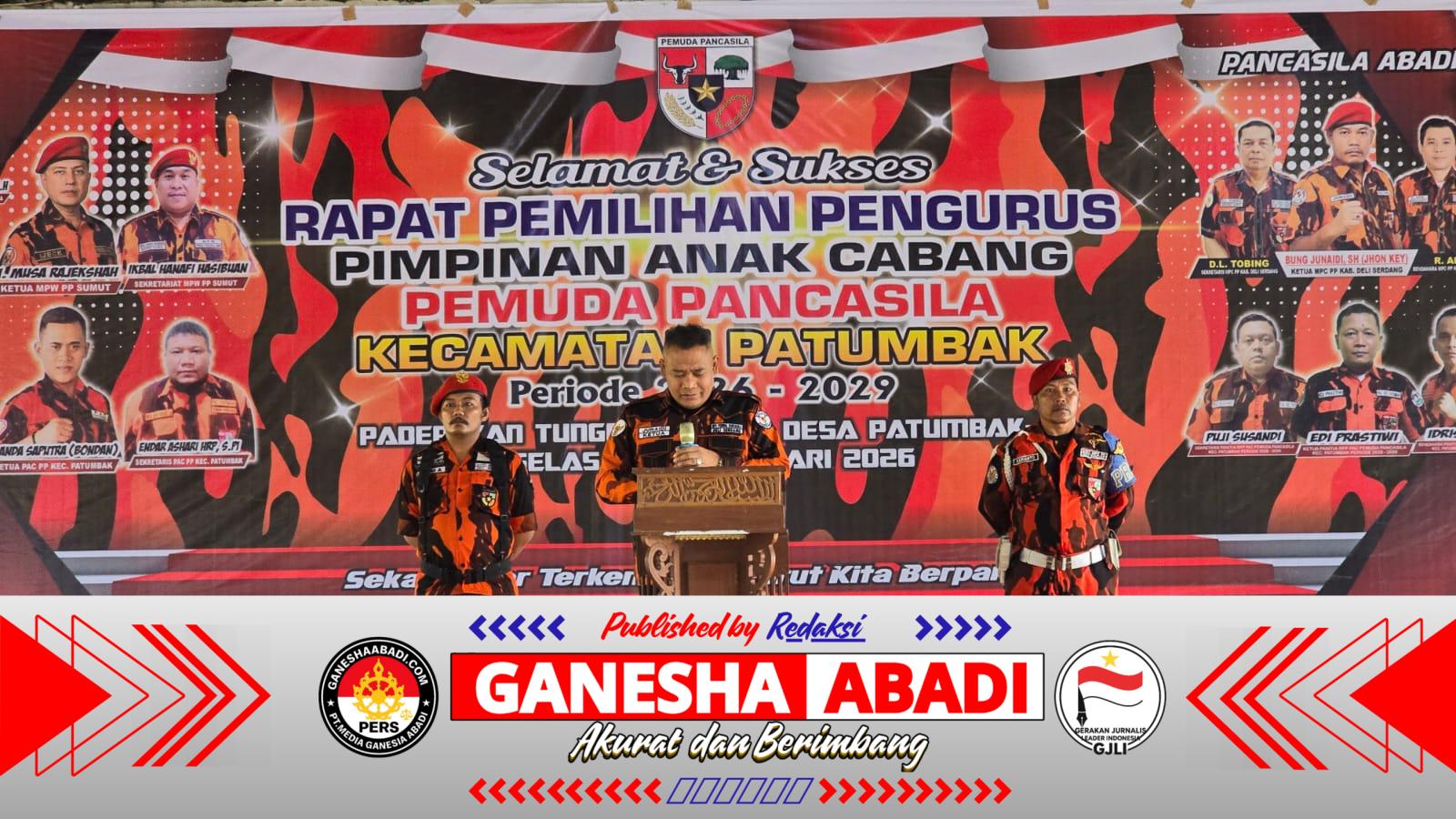 DELI SERDANG – Ganda Saputra ‘Bondan’ kembali terpilih secara aklamasi sebagai Ketua Pimpinan Anak Cabang (PAC) Pemuda Pancasila (PP) Kecamatan Patumbak, Kabupaten Deli Serdang, Sumatera Utara (Sumut) periode 2026-2029 pada Rapat Pemilihan Pengurus (RPP) yang digelar di Padepokan Tunggal Roso, Desa Patumbak II pada Selasa (17/2/2026) sore.