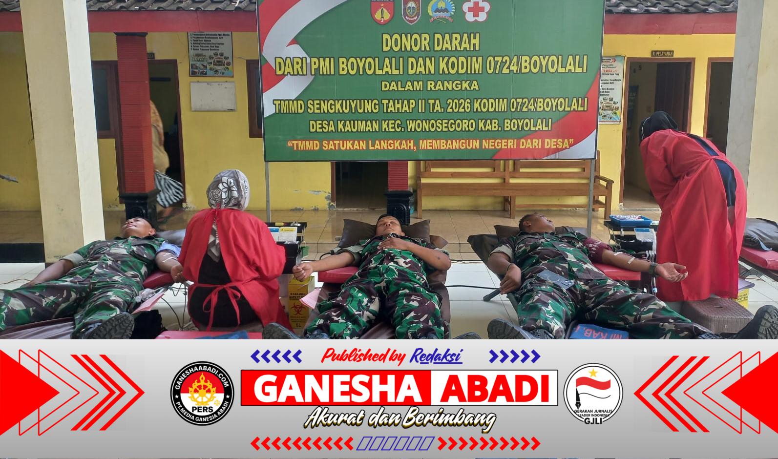 Boyolali – Semangat kepedulian dan kebersamaan kembali ditunjukkan Kodim 0724/Boyolali melalui kegiatan non fisik dalam program TMMD Sengkuyung. Bersinergi dengan PMI Kabupaten Boyolali, digelar bakti sosial donor darah yang berlangsung di Balai Desa Kauman, Kecamatan Wonosegoro, Senin (27/04/26). Kegiatan ini menjadi wujud nyata kontribusi TNI dalam membantu sesama sekaligus memperkuat kemanunggalan dengan rakyat.