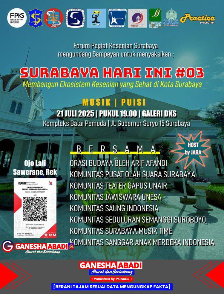 Hal tersebut mendorong Forum Pegiat Kesenian Surabaya (FPKS) untuk menginisiasi program “Membangun Ekosistem Seni yang Sehat di Surabaya” yang akan berlangsung pada 21 Juli 2025, pukul 19.00 WIB, di Galeri DKS.