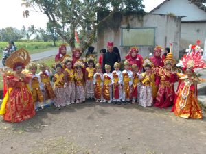 BUMIHARJO – TK Dharma Wanita 64 bersama kepala desa Bapak Sutarji yang mengenakan busana selayaknya “Warok” turut memeriahkan Karnaval Desa Bumiharjo, Kecamatan Glenmore, Banyuwangi. Senin (19/08/2024)
