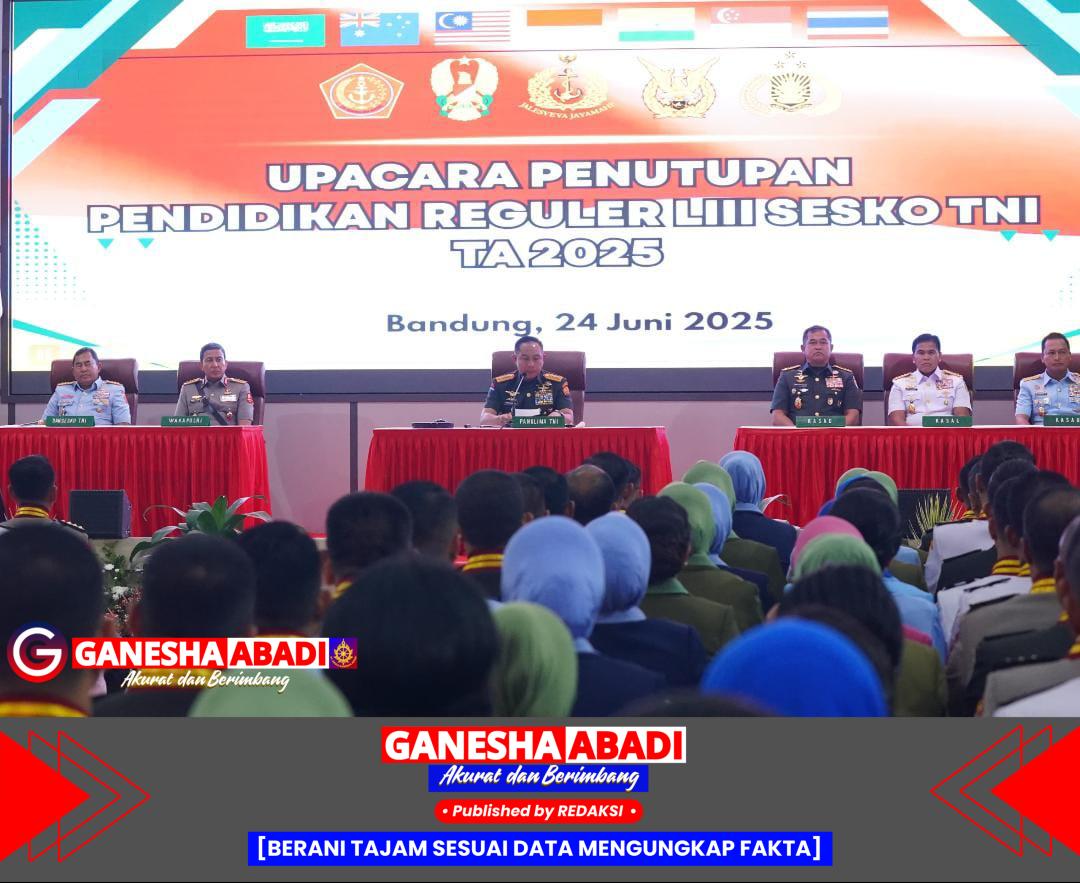 Bandung – Panglima TNI Jenderal TNI Agus Subiyanto resmi menutup Pendidikan Reguler (Dikreg) LIII Sesko TNI TA 2025 dalam upacara di Gedung Serasan, Sesko TNI, Bandung, Selasa (24/6/2025). Pendidikan strategis ini diikuti 212 Perwira Menengah dari TNI, Polri, dan negara sahabat.