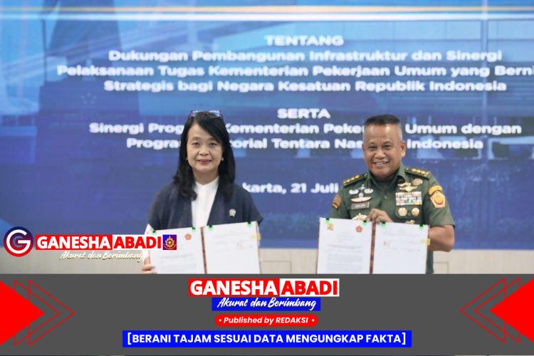 Jakarta – Tentara Nasional Indonesia (TNI) bersama Kementerian Pekerjaan Umum (PU) menandatangani Nota Kesepahaman (MoU) untuk memperkuat sinergi dalam pembangunan infrastruktur nasional, Senin (21/7/2025). Penandatanganan berlangsung di Pendopo Kementerian PU, Jl. Pattimura No.20, Kebayoran Baru, Jakarta Selatan.